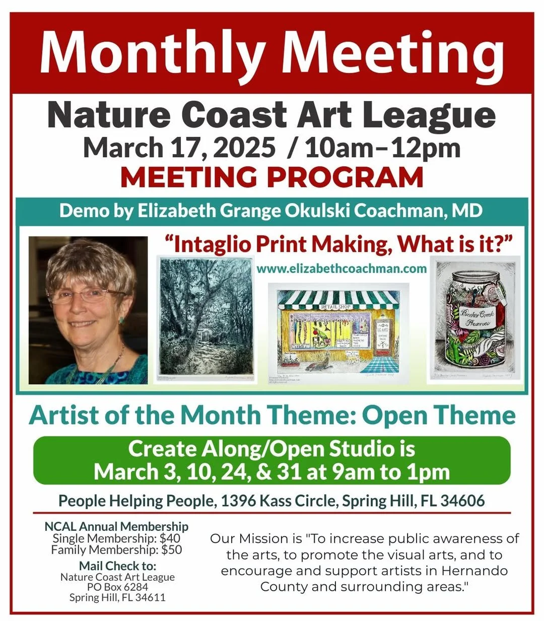 The Nature Coast Art League also hosts Create Along/Open Studio Sessions for members every Monday. The February Create Along sessions are Febuary 3, 10, & 24 from 9 AM - 1 PM